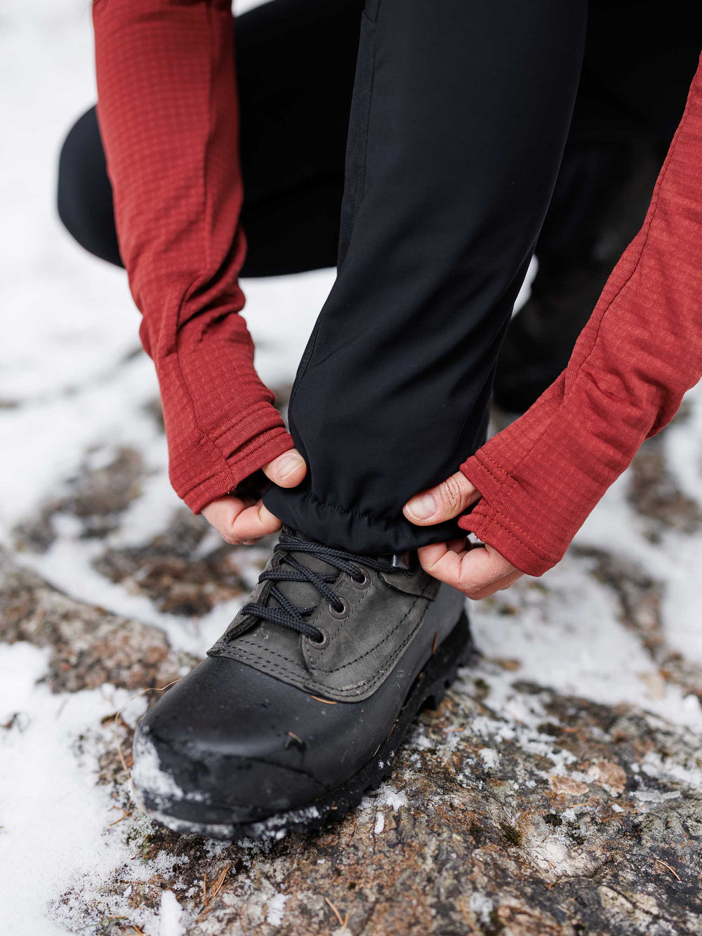 In order to adapt perfectly to ski boots as well as a variety of hiking boots, our APEX leggings have a zipper at the hem that can be opened as needed. A silicon grip on the cuffs ensures a secure fit, whichever boots you choose.